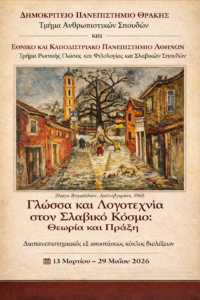 Ο Διαπανεπιστημιακός εξ αποστάσεως κύκλος διαλέξεων «Γλώσσα και Λογοτεχνία στον Σλαβικό Κόσμο: Θεωρία και Πράξη» συνδιοργανώνεται από το Δημοκρίτειο Πανεπιστήμιο Θράκης, Τμήμα Ανθρωπιστικών Σπουδών, και το Εθνικό και Καποδιστριακό Πανεπιστήμιο Αθηνών, Τμήμα Ρωσικής Γλώσσας και Φιλολογίας και Σλαβικών Σπουδών. Η δράση υλοποιείται αποκλειστικά διαδικτυακά, στο πλαίσιο διαπανεπιστημιακής συνεργασίας, κατά τη διάρκεια του εαρινού εξαμήνου 2026.