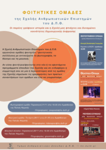 Αν είσαι φοιτήτρια/φοιτητής στα νέα ή τα υφιστάμενα προγράμματα σπουδών της Σχολής και σε ενδιαφέρει η συμμετοχή σου σε μία ή περισσότερες από τις ομάδες της Σχολής σημείωσε τις ημερομηνίες των πρώτων συναντήσεων των ομάδων και έλα να γνωριστούμε.